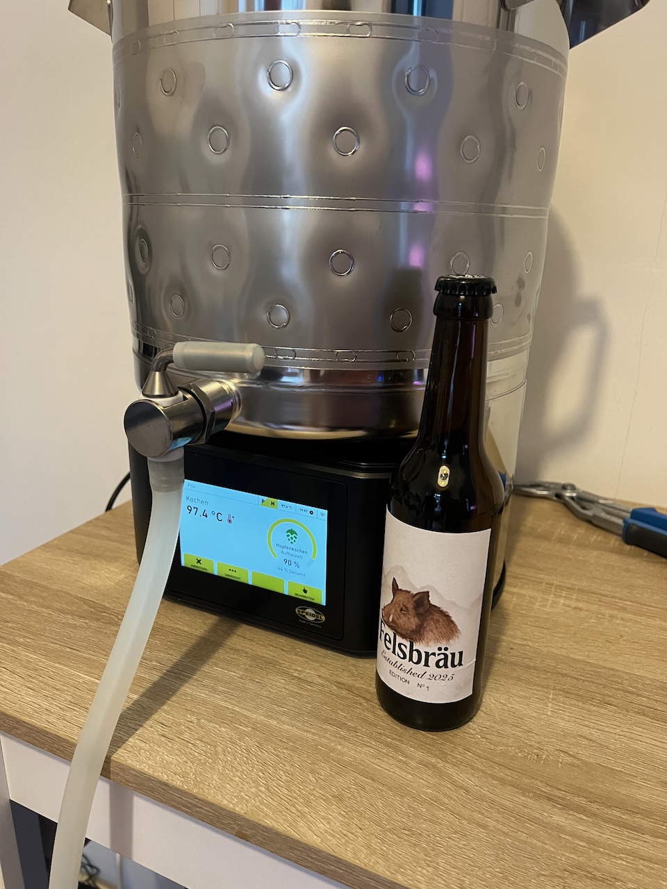 Das Herzstück von Felsbräu ist der Speidels Braumeister 10L – eine kompakte, aber vollwertige Brauanlage, die vollständig automatisiert arbeitet. Temperaturkurven, Rastzeiten, Läuterung – alles präzise steuerbar und reproduzierbar. Für zwei junge Hobbybrauer ist das eine ernsthafte Plattform, die professionelles Arbeiten in kleinem Maßstab ermöglicht.